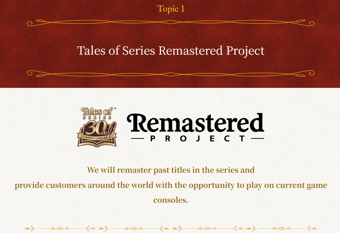 Logo após a divulgação do vídeo, a Bandai Namco abriu um site japonês dedicado ao aniversário de Tales of. Nele, é possível ver todos os protagonistas da série, incluindo até jogos mobiles, como também outras informações diversas. A que mais chamou atenção e foi motivo de esperança é do projeto Tales of Series Remastered. Nesse tópico, há uma mensagem animadora e que reforça a ideia do projeto: