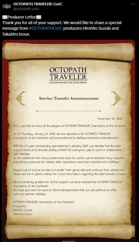 A partir de quinta-feira, 16 de janeiro de 2025, as operações de serviço do Octopath Traveler: Champions of the Continent serão transferidas para a NetEase Interactive Entertainment.