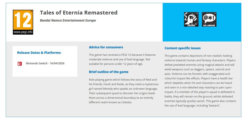 O usuário do Twitter @Wario64 identificou que o órgão Pan European Game Information (PEGI) classificou o ainda não anunciado Tales of Eternia Remastered.